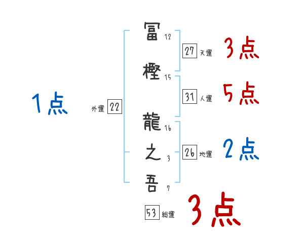 外運![]() | 冨樫龍之吾さんの外運は22画の1つ星!努力することが苦手ないっぽう手先が器用。芸術性にも優れる。 生活面を象徴する運勢です。外部から受ける影響力を表し、結婚運、家庭運や職場、環境への順応性を表します。 |