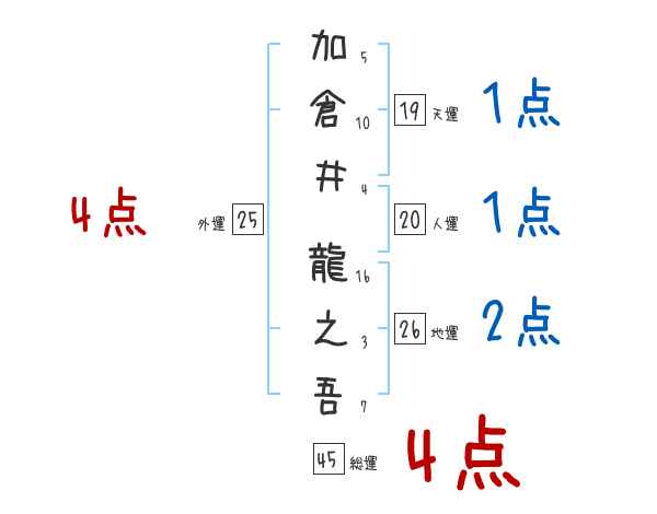 天運![]() | 加倉井龍之吾さんの天運は19画の1つ星!優れた才能を持ちますが、協調性が足りないことも。周りの人と協力する事を意識しましょう。 家系が持つ宿命的な運勢を表します。祖先から受け継いだ苗字ですので自分の力が及びません。家柄を象徴します。 |