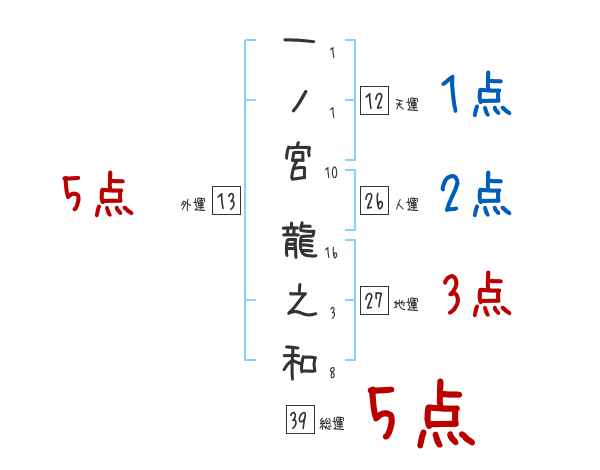総運![]() | 一ノ宮龍之和さんの総運は39画の5つ星!社交性に優れ人望が厚い。人の上に立ち成功する。 あなたの人生を表す1番重要な運勢です。生涯を通じて影響する総合運となり、主に50歳以降の晩年期に影響を及ぼします。 |