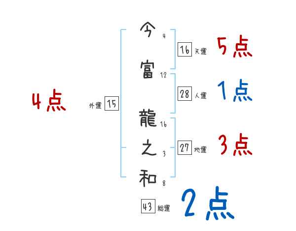 総運![]() | 今富龍之和さんの総運は43画の2つ星!頑固な性格で独立心が強いかも。やや非現実的で浪費に注意しましょう。 あなたの人生を表す1番重要な運勢です。生涯を通じて影響する総合運となり、主に50歳以降の晩年期に影響を及ぼします。 |