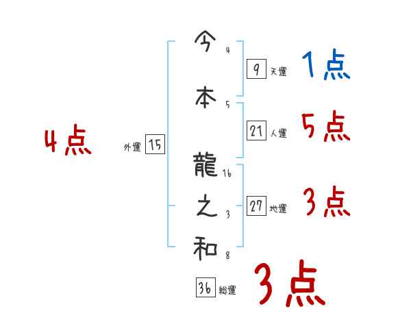総運![]() | 今本龍之和さんの総運は36画の3つ星!先見性が豊かです。多少神経質で苦労することも。 あなたの人生を表す1番重要な運勢です。生涯を通じて影響する総合運となり、主に50歳以降の晩年期に影響を及ぼします。 |
