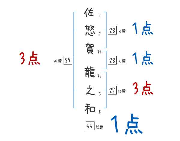 天運![]() | 佐怒賀龍之和さんの天運は28画の1つ星!家庭環境に注意。スポーツで活躍できる能力があるかも。 家系が持つ宿命的な運勢を表します。祖先から受け継いだ苗字ですので自分の力が及びません。家柄を象徴します。 |