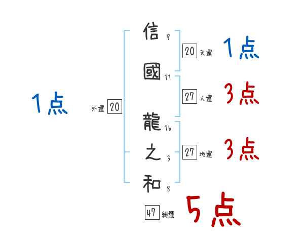 総運![]() | 信國龍之和さんの総運は47画の5つ星!実力が開花し発展する円満な人生。財に恵まれる。 あなたの人生を表す1番重要な運勢です。生涯を通じて影響する総合運となり、主に50歳以降の晩年期に影響を及ぼします。 |