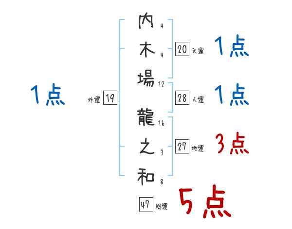 外運![]() | 内木場龍之和さんの外運は19画の1つ星!優れた才能を持ちますが、協調性が足りないことも。周りの人と協力する事を意識しましょう。 生活面を象徴する運勢です。外部から受ける影響力を表し、結婚運、家庭運や職場、環境への順応性を表します。 |