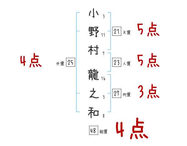 天運![]() | 小野村龍之和さんの天運は21画の5つ星!統率力がある。独立し成功する。名誉を手に入れる。 家系が持つ宿命的な運勢を表します。祖先から受け継いだ苗字ですので自分の力が及びません。家柄を象徴します。 |