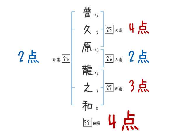 外運![]() | 普久原龍之和さんの外運は26画の2つ星!波瀾万丈かも。信頼できる人を大事にしましょう。 生活面を象徴する運勢です。外部から受ける影響力を表し、結婚運、家庭運や職場、環境への順応性を表します。 |
