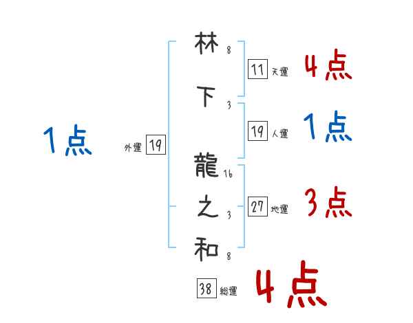 人運![]() | 林下龍之和さんの人運は19画の1つ星!優れた才能を持ちますが、協調性が足りないことも。周りの人と協力する事を意識しましょう。 性格や才能などを表す2番目に重要な運勢です。人間関係や協調性、社会的な成功に影響します。主に20歳から50歳ぐらいまでの中年期の運勢を表します。 |
