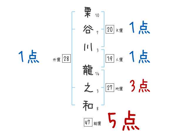 外運![]() | 栗谷川龍之和さんの外運は28画の1つ星!家庭環境に注意。スポーツで活躍できる能力があるかも。 生活面を象徴する運勢です。外部から受ける影響力を表し、結婚運、家庭運や職場、環境への順応性を表します。 |