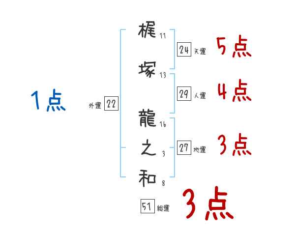 天運![]() | 梶塚龍之和さんの天運は24画の5つ星!家庭運が良く順調な人生。金運にも恵まれる。 家系が持つ宿命的な運勢を表します。祖先から受け継いだ苗字ですので自分の力が及びません。家柄を象徴します。 |