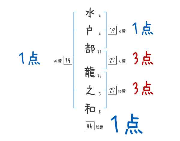 天運![]() | 水戸部龍之和さんの天運は19画の1つ星!優れた才能を持ちますが、協調性が足りないことも。周りの人と協力する事を意識しましょう。 家系が持つ宿命的な運勢を表します。祖先から受け継いだ苗字ですので自分の力が及びません。家柄を象徴します。 |