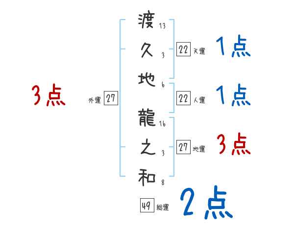 渡久地龍之和さんの画数の鑑定結果
