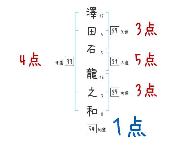 天運![]() | 澤田石龍之和さんの天運は27画の3つ星!頭脳明晰だが強情で摩擦が多い傾向。孤立に注意。 家系が持つ宿命的な運勢を表します。祖先から受け継いだ苗字ですので自分の力が及びません。家柄を象徴します。 |