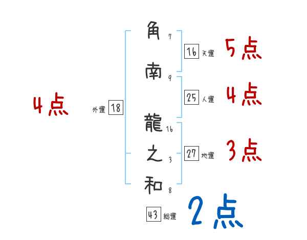 天運![]() | 角南龍之和さんの天運は16画の5つ星!人望が厚く大きく発展する。逆転成功が見える。 家系が持つ宿命的な運勢を表します。祖先から受け継いだ苗字ですので自分の力が及びません。家柄を象徴します。 |