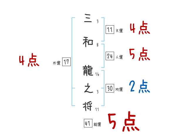 天運![]() | 三和龍之将さんの天運は11画の4つ星!着実に富や地位を得る幸運な人生。 家系が持つ宿命的な運勢を表します。祖先から受け継いだ苗字ですので自分の力が及びません。家柄を象徴します。 |