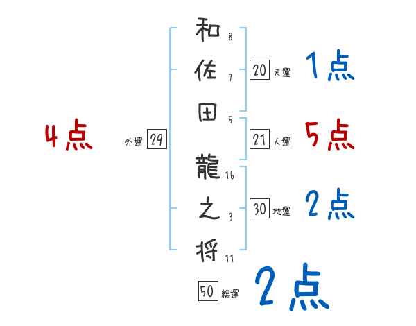 外運![]() | 和佐田龍之将さんの外運は29画の4つ星!完全主義で才能がある。厳格な心の持ち主。 生活面を象徴する運勢です。外部から受ける影響力を表し、結婚運、家庭運や職場、環境への順応性を表します。 |