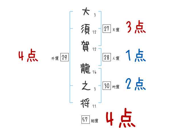 総運![]() | 大須賀龍之将さんの総運は57画の4つ星!向上心があり人望がある。地位を得る。 あなたの人生を表す1番重要な運勢です。生涯を通じて影響する総合運となり、主に50歳以降の晩年期に影響を及ぼします。 |