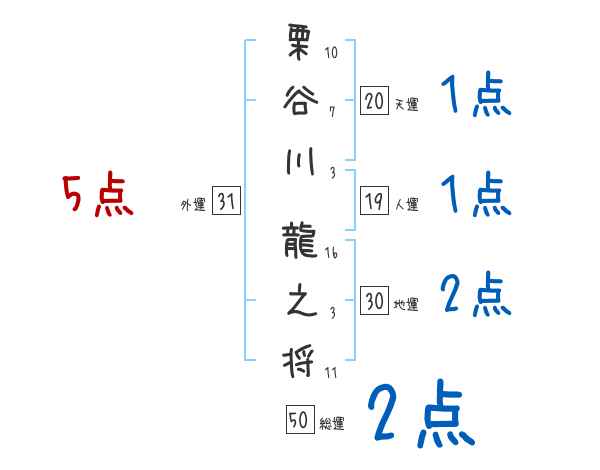 人運![]() | 栗谷川龍之将さんの人運は19画の1つ星!優れた才能を持ちますが、協調性が足りないことも。周りの人と協力する事を意識しましょう。 性格や才能などを表す2番目に重要な運勢です。人間関係や協調性、社会的な成功に影響します。主に20歳から50歳ぐらいまでの中年期の運勢を表します。 |