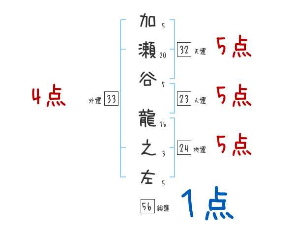 天運![]() | 加瀬谷龍之左さんの天運は32画の5つ星!柔軟性があり成功する。チャンスが多く金運が良い。 家系が持つ宿命的な運勢を表します。祖先から受け継いだ苗字ですので自分の力が及びません。家柄を象徴します。 |