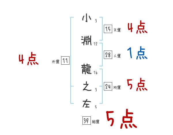 天運![]() | 小淵龍之左さんの天運は15画の4つ星!人徳があり出世する。順調に物事を進め円満な人生。 家系が持つ宿命的な運勢を表します。祖先から受け継いだ苗字ですので自分の力が及びません。家柄を象徴します。 |