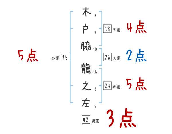 天運![]() | 木戸脇龍之左さんの天運は18画の4つ星!情熱的で剛気。忍耐力があり信頼される。 家系が持つ宿命的な運勢を表します。祖先から受け継いだ苗字ですので自分の力が及びません。家柄を象徴します。 |