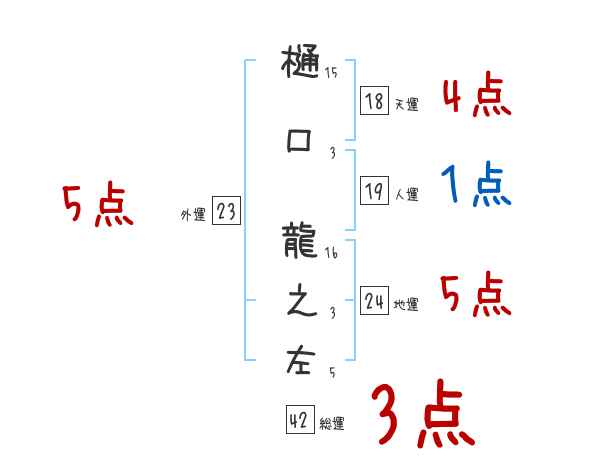 天運![]() | 樋口龍之左さんの天運は18画の4つ星!情熱的で剛気。忍耐力があり信頼される。 家系が持つ宿命的な運勢を表します。祖先から受け継いだ苗字ですので自分の力が及びません。家柄を象徴します。 |