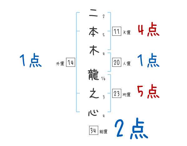天運![]() | 二本木龍之心さんの天運は11画の4つ星!着実に富や地位を得る幸運な人生。 家系が持つ宿命的な運勢を表します。祖先から受け継いだ苗字ですので自分の力が及びません。家柄を象徴します。 |