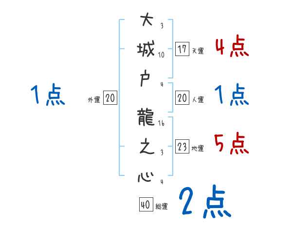 総運![]() | 大城戸龍之心さんの総運は40画の2つ星!自信過剰で物事に固執するためトラブルに注意。 あなたの人生を表す1番重要な運勢です。生涯を通じて影響する総合運となり、主に50歳以降の晩年期に影響を及ぼします。 |