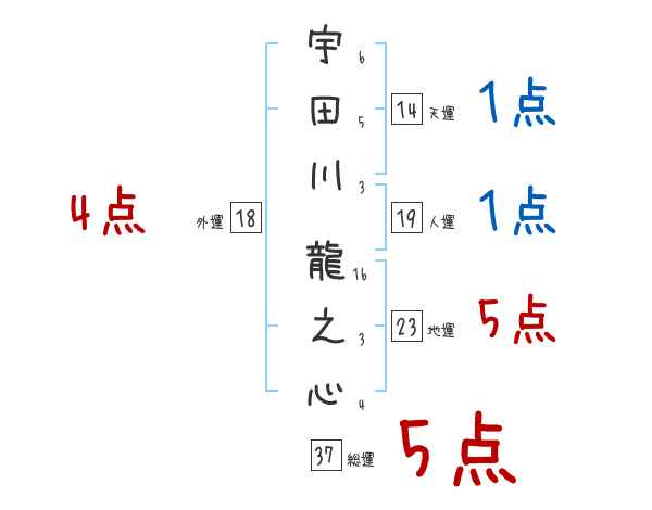 天運![]() | 宇田川龍之心さんの天運は14画の1つ星!人に対して優しいがストレスを溜め込みがち。人間関係のトラブルを避けるよう気をつけましょう。 家系が持つ宿命的な運勢を表します。祖先から受け継いだ苗字ですので自分の力が及びません。家柄を象徴します。 |