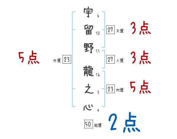 宇留野龍之心さんの画数の鑑定結果