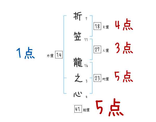天運![]() | 折笠龍之心さんの天運は18画の4つ星!情熱的で剛気。忍耐力があり信頼される。 家系が持つ宿命的な運勢を表します。祖先から受け継いだ苗字ですので自分の力が及びません。家柄を象徴します。 |