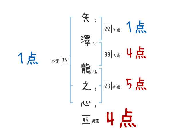 | 天運  | 矢澤龍之心さんの天運は22画の1つ星!努力することが苦手ないっぽう手先が器用。芸術性にも優れる。家系が持つ宿命的な運勢を表します。祖先から受け継いだ苗字ですので自分の力が及びません。家柄を象徴します。 |