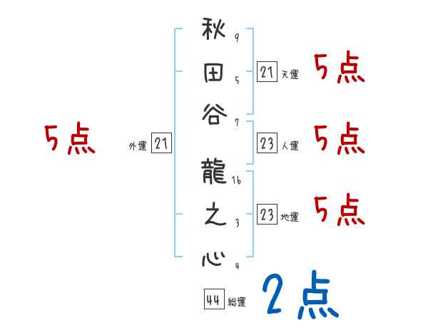 天運![]() | 秋田谷龍之心さんの天運は21画の5つ星!統率力がある。独立し成功する。名誉を手に入れる。 家系が持つ宿命的な運勢を表します。祖先から受け継いだ苗字ですので自分の力が及びません。家柄を象徴します。 |