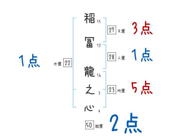 総運![]() | 稲冨龍之心さんの総運は50画の2つ星!浮き沈みが激しく不安定。しりすぼみに衰退しやすいので注意しましょう。 あなたの人生を表す1番重要な運勢です。生涯を通じて影響する総合運となり、主に50歳以降の晩年期に影響を及ぼします。 |