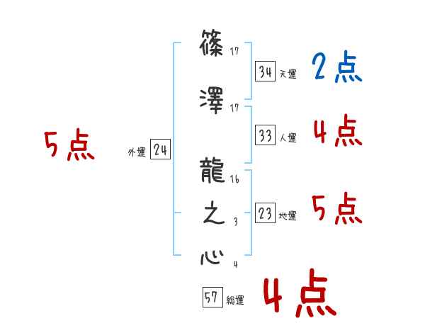 総運![]() | 篠澤龍之心さんの総運は57画の4つ星!向上心があり人望がある。地位を得る。 あなたの人生を表す1番重要な運勢です。生涯を通じて影響する総合運となり、主に50歳以降の晩年期に影響を及ぼします。 |