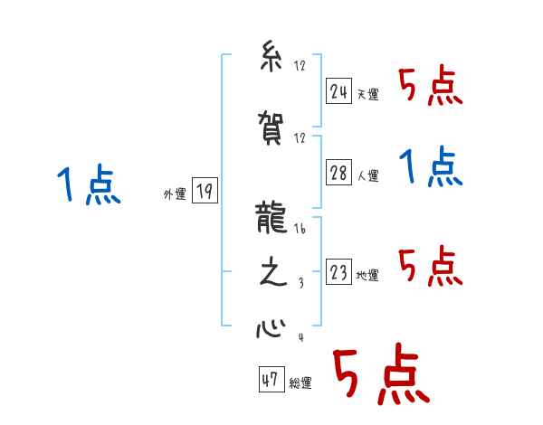 総運![]() | 糸賀龍之心さんの総運は47画の5つ星!実力が開花し発展する円満な人生。財に恵まれる。 あなたの人生を表す1番重要な運勢です。生涯を通じて影響する総合運となり、主に50歳以降の晩年期に影響を及ぼします。 |