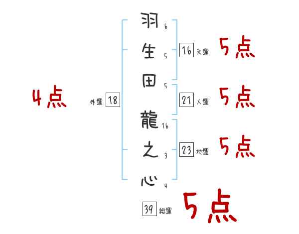 天運![]() | 羽生田龍之心さんの天運は16画の5つ星!人望が厚く大きく発展する。逆転成功が見える。 家系が持つ宿命的な運勢を表します。祖先から受け継いだ苗字ですので自分の力が及びません。家柄を象徴します。 |