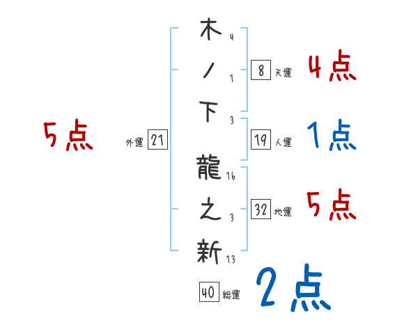 地運![]() | 木ノ下龍之新さんの地運は32画の5つ星!柔軟性があり成功する。チャンスが多く金運が良い。 個性を表す基礎的な運勢です。性格形成や対人関係、行動力など家庭環境に影響されます。主に誕生してから20歳くらいまでの若年期の運勢を表します。 |