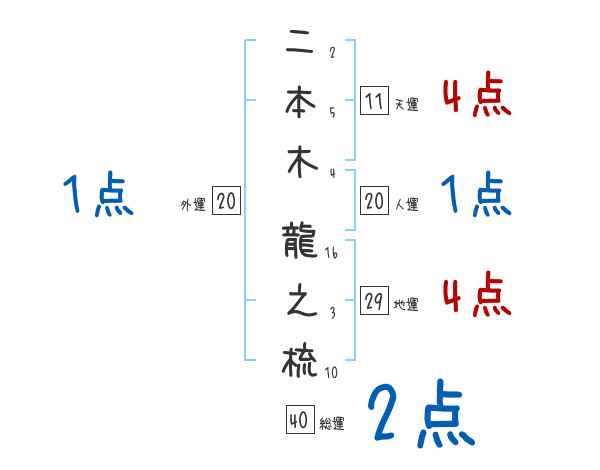 総運![]() | 二本木龍之梳さんの総運は40画の2つ星!自信過剰で物事に固執するためトラブルに注意。 あなたの人生を表す1番重要な運勢です。生涯を通じて影響する総合運となり、主に50歳以降の晩年期に影響を及ぼします。 |