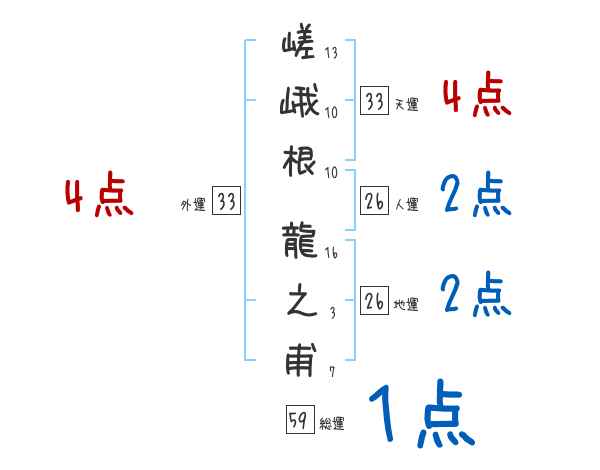 天運![]() | 嵯峨根龍之甫さんの天運は33画の4つ星!権力志向でプライドが高い。勇気があり運を切り開き成功する。 家系が持つ宿命的な運勢を表します。祖先から受け継いだ苗字ですので自分の力が及びません。家柄を象徴します。 |