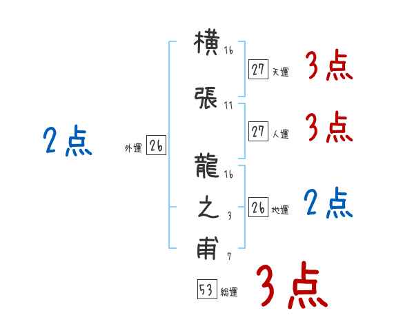 外運![]() | 横張龍之甫さんの外運は26画の2つ星!波瀾万丈かも。信頼できる人を大事にしましょう。 生活面を象徴する運勢です。外部から受ける影響力を表し、結婚運、家庭運や職場、環境への順応性を表します。 |
