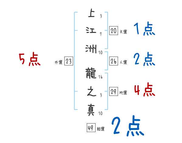 人運![]() | 上江洲龍之真さんの人運は26画の2つ星!波瀾万丈かも。信頼できる人を大事にしましょう。 性格や才能などを表す2番目に重要な運勢です。人間関係や協調性、社会的な成功に影響します。主に20歳から50歳ぐらいまでの中年期の運勢を表します。 |