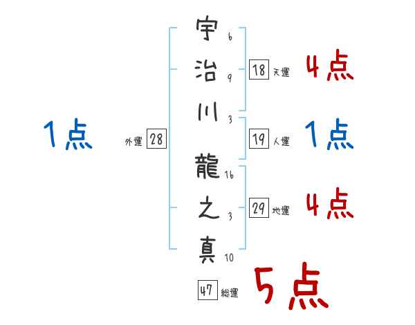 人運![]() | 宇治川龍之真さんの人運は19画の1つ星!優れた才能を持ちますが、協調性が足りないことも。周りの人と協力する事を意識しましょう。 性格や才能などを表す2番目に重要な運勢です。人間関係や協調性、社会的な成功に影響します。主に20歳から50歳ぐらいまでの中年期の運勢を表します。 |