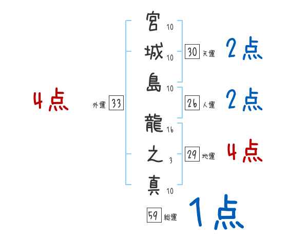 外運![]() | 宮城島龍之真さんの外運は33画の4つ星!権力志向でプライドが高い。勇気があり運を切り開き成功する。 生活面を象徴する運勢です。外部から受ける影響力を表し、結婚運、家庭運や職場、環境への順応性を表します。 |