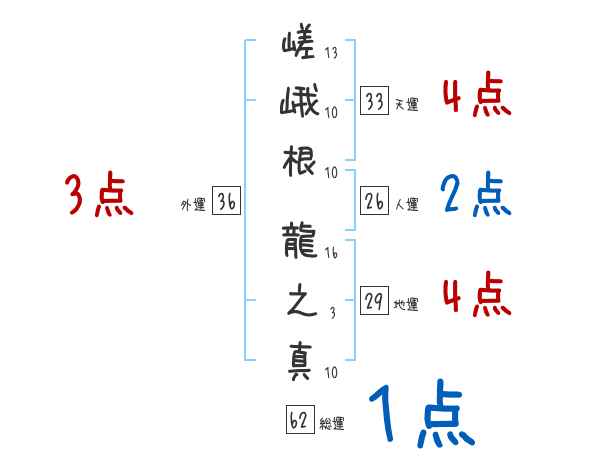 総運![]() | 嵯峨根龍之真さんの総運は62画の1つ星!困難なトラブルが多く精神的に疲労しないように気をつけましょう。 あなたの人生を表す1番重要な運勢です。生涯を通じて影響する総合運となり、主に50歳以降の晩年期に影響を及ぼします。 |