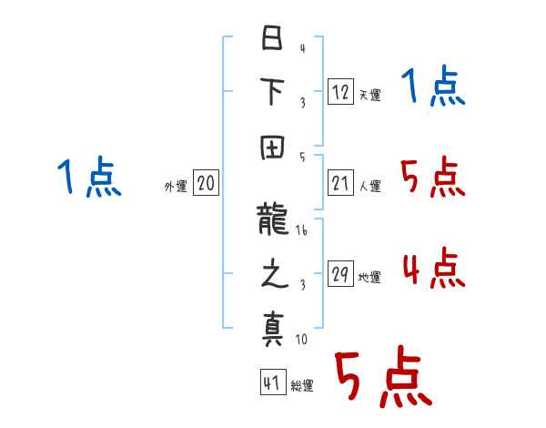 天運![]() | 日下田龍之真さんの天運は12画の1つ星!簡単な失敗で諦めてしまいやすいかも。着実に行動すると良いでしょう。 家系が持つ宿命的な運勢を表します。祖先から受け継いだ苗字ですので自分の力が及びません。家柄を象徴します。 |