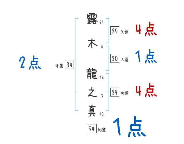 | 外運  | 露木龍之真さんの外運は34画の2つ星!独創性に優れるが、自尊心が強く災難に注意しましょう。生活面を象徴する運勢です。外部から受ける影響力を表し、結婚運、家庭運や職場、環境への順応性を表します。 |