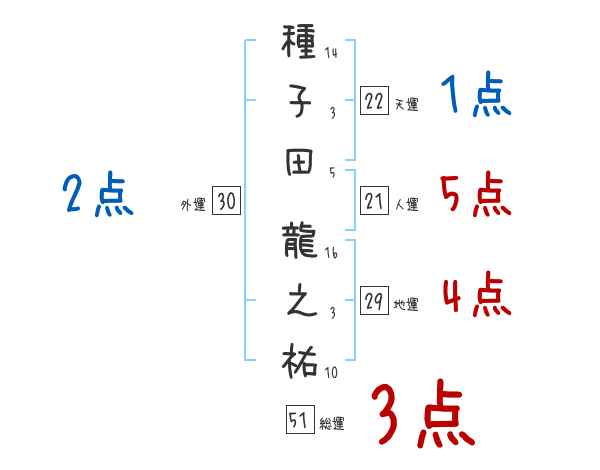 外運![]() | 種子田龍之祐さんの外運は30画の2つ星!浮き沈みの激しさに注意しましょう。 生活面を象徴する運勢です。外部から受ける影響力を表し、結婚運、家庭運や職場、環境への順応性を表します。 |