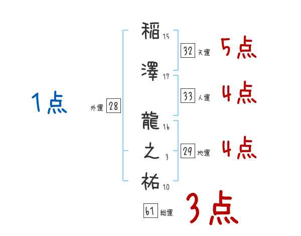 外運![]() | 稲澤龍之祐さんの外運は28画の1つ星!家庭環境に注意。スポーツで活躍できる能力があるかも。 生活面を象徴する運勢です。外部から受ける影響力を表し、結婚運、家庭運や職場、環境への順応性を表します。 |