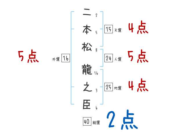 総運![]() | 二本松龍之臣さんの総運は40画の2つ星!自信過剰で物事に固執するためトラブルに注意。 あなたの人生を表す1番重要な運勢です。生涯を通じて影響する総合運となり、主に50歳以降の晩年期に影響を及ぼします。 |
