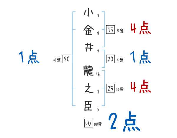 外運![]() | 小金井龍之臣さんの外運は20画の1つ星!社交が苦手。人とは違った才能があり波乱万丈な人生かも。 生活面を象徴する運勢です。外部から受ける影響力を表し、結婚運、家庭運や職場、環境への順応性を表します。 |